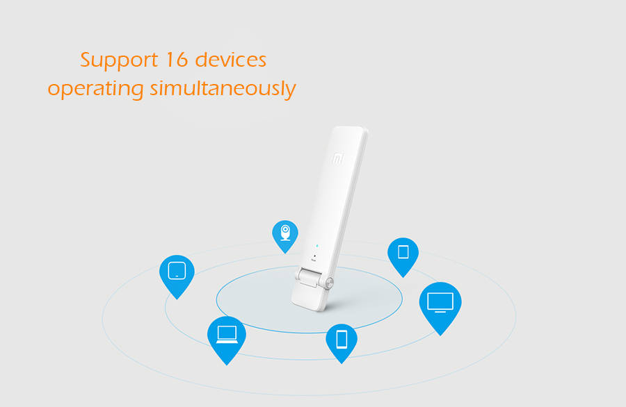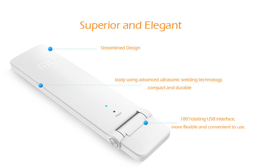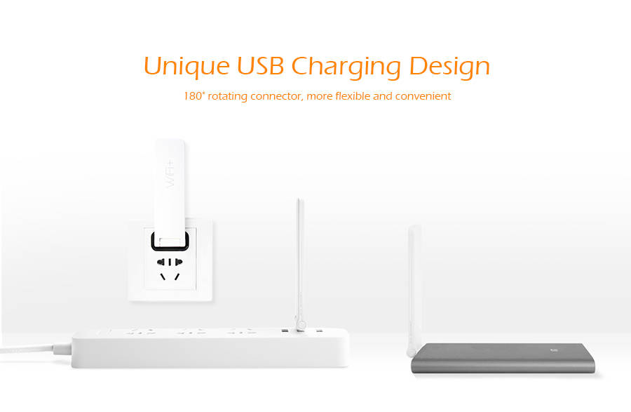 1. Streamlined design, simple but elegant. 2. Built in dual antennas, and transfer rate up to 300Mbps, twice as fast as first generation, avoid the existence of wifi signal bilind zone. 3. Unique USB charging design, and the interface support 180° rotating, more flexible and convenient. 4. Easily pairing, insert the wifi amplifier to the router, blue indicator displaying shows successfully paired. 5. Automatically networking, quickly realizing a complete coverage of the wifi signal, support 16 devices operating at the same time. 6. Support signal detection, through the xiaomi app, accurately detact the wifi signal,and it would inform you if something is wrong.