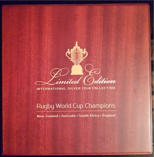 Contains a coin from each of the past winning nations (New Zealand, Australia, South Africa and England)