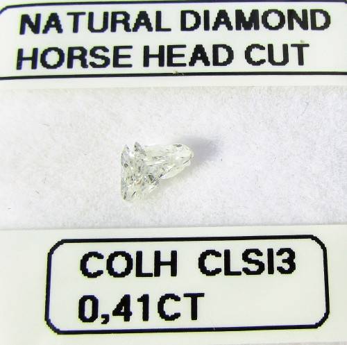The diamond has a trade term of "horse head cut diamond" cut which is extremely rare and valuable. Animal and horse lovers alike will be more than happy to own a rarity like this. Very very unusual and certainly worth the bid. Good luck!!
