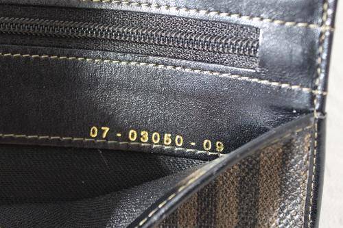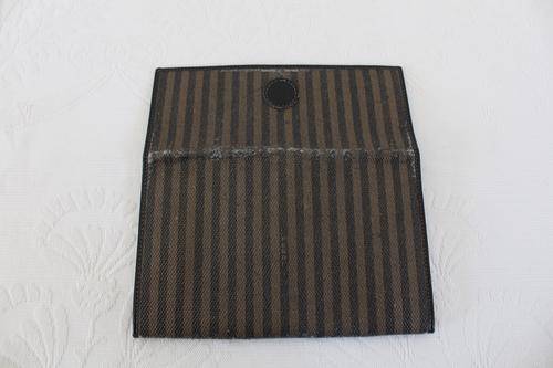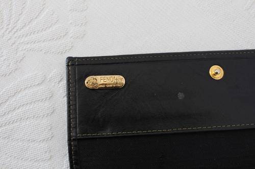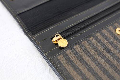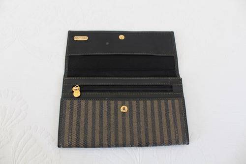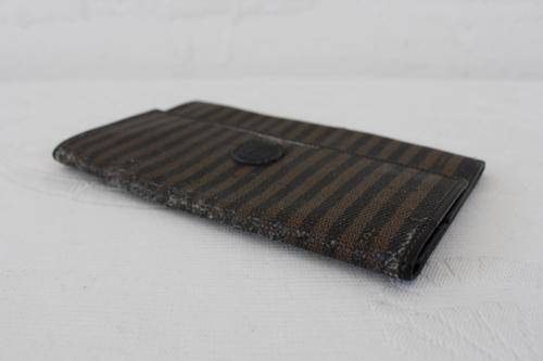 Authentic vintage Fendi luxury designer striped brown/ green wallet. Coated canvas with quality real leather lining. Includes serial/ authenticity code stamped inside. Hardware is signed "Fendi". Overall good condition, with some wear to coated canvas outside, especially where wallet folds and very good condition inside. Measures 17 cm x 11 cm.