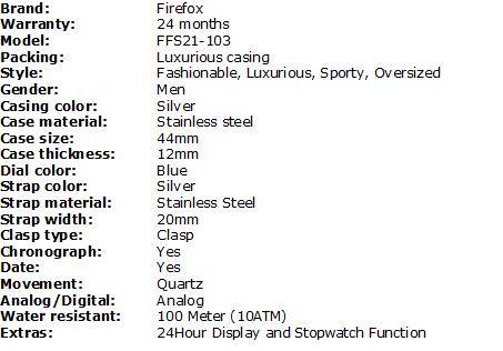 Topwatch INC is proud to present FIREFOX Watches. We are the SOLE REGISTERED DISTRIBUTOR FOR THE ENTIRE SOUTH AFRICA so authenticity is 100% Guaranteed or 200% your money back. Firefox watches have strict quality standards with each watch manufactured to perfection. Firefox is a relatively new company with its Head offices in Mannheim Germany. Firefox watches are produced with either Japanese or Swiss movements depending on the model. Firefox watches have unique designs as well as the processing of high-quality materials each watch is accompanied with a 2 Year Guarantee for your security and excellent after sales service provided to you by the Sole Registered Distributor for South Africa Topwatch INC.