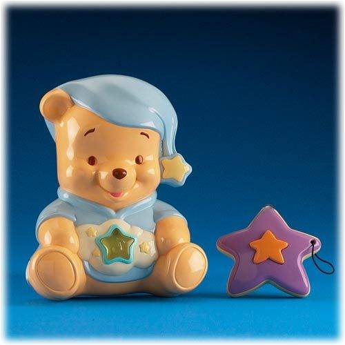 Baby will have the sweetest of dreams when Pooh sings them to sleep! Pooh sings “Twinkle, Twinkle Little Star” as soothing images appear on the ceiling. The projector also features 4 melodies and the star on Pooh’s tummy can be used as a nightlight for the nursery! There’s also a remote control for parents and two modes to control music and projection durations. Requires 4 "AA" batteries.