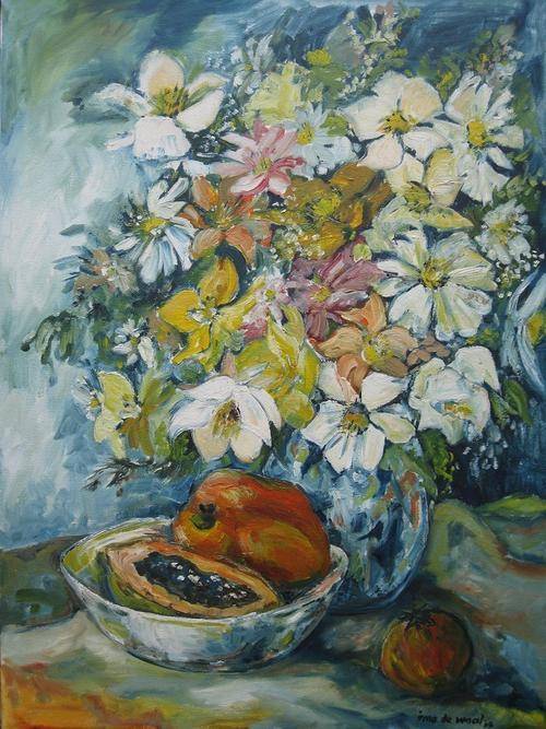 A colourful still life of flowers and paw-paws. The beautiful painting has been painted in a impressionistic way to enhance the atmosphere of any home.