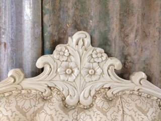 A beautiful French Inspired Queen size Headboard with deep buttoned covering and ornate scroll work.