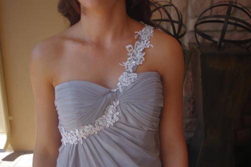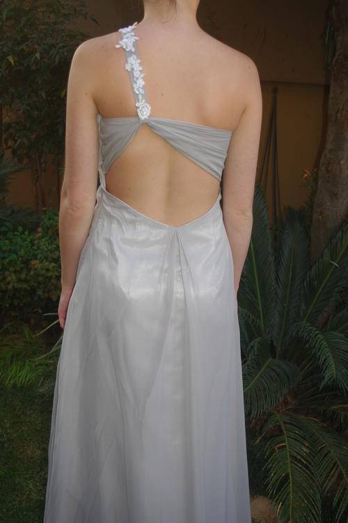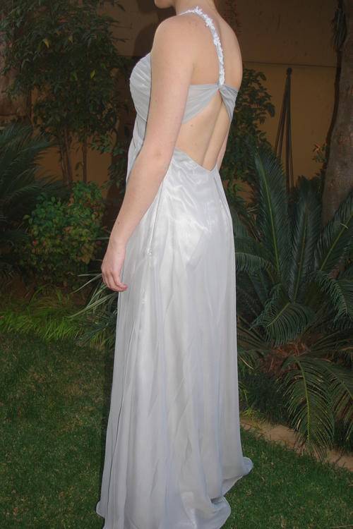"Stunning" Imported Matric Farewell / Floor Length Evening Dress, Grey/Silver Chiffon with silver lining, Size 32. Bra size 32B. Side Thigh long Split, Stunning Back detail, with White Lace Trim (Crystals can be added for extra GLAM!!!) See my other auctions for Crystals. The pictures don't do it Justice..