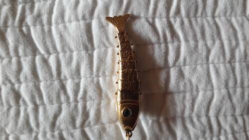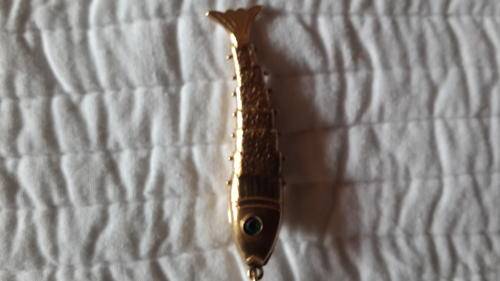 ?GOLD PLATE FISH PENDENT WITH GREEN STONES IN EYES