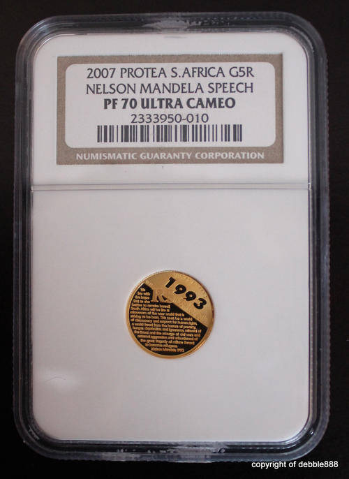 This coin was minted by the S.A. Mint in 2007 in celebration of Nelson Mandela receiving the Nobel Peace Prize in 1993. An extract from Mandela's acceptance speech is found on the reverse.