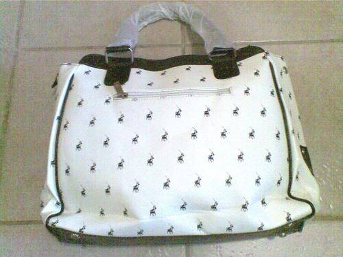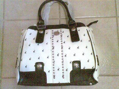 BEAUTIFUL ORIGINAL POLO HANDBAG WITH CERTIFICATE -BLACK & WHITE, DIAMANTE DESIGN AROUND LOGO. CENTRAL ZIP CLOSURE, FULLY LINED INNER, HAS A BACK ZIP AS WELL. LENGHT- 36CM, HEIGHT 33CM- COMPLETE WITH POLO DUST BAG. A GR8 XMAS GIFT..