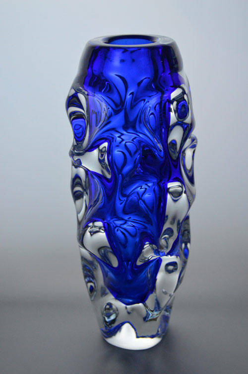MAGNIFICENT & HEAVY ŠKRDLOVICÉ BRIGHT BLUE AND TRANSPARENT VASE, DESIGNED BY THE FAMOUS JAN BERÁNEK (1933-) IN 1959