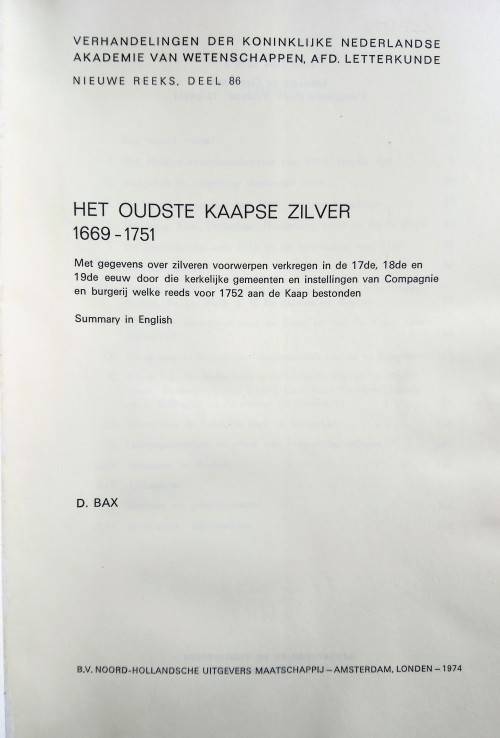 Written by D Bax. Listing silver given to the Dutch East India Company by the churches of Holland before 1752, during the Dutch stellement at the Cape.