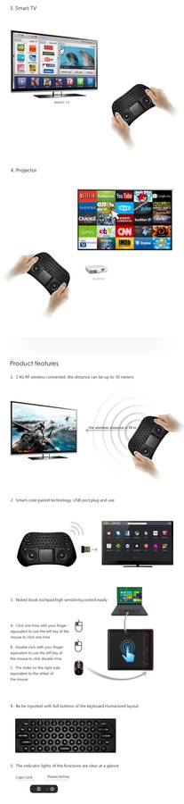 WORKS GREAT FOR PRESENTATIONS, ANDROID TV BOX, CERTAIN SMART TV'S, PC, LAPTOP, PS3 . HAS A TOUCHPAD LIKE A NORMAL LAPTOP, WHICH MAKES USING IT VERY INTUITIVE AND EASY TO USE. HAS A RECHARGEABLE BATTERY, WHICH MAKES IT EVEN MORE USEFUL. STOCK IS AVAILABLE LOCALLY FOR OVERNIGHT DELIVERY.
