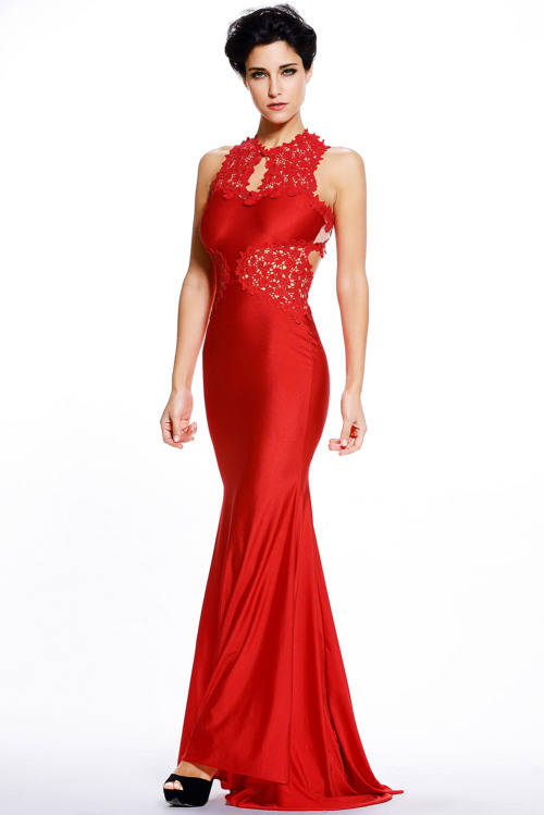 Shimmering floral appliques on mesh accent the sheath silhouette of this gown, defining the sweetheart bodice with illusion side cutouts which meet beneath the cutout back. The sheer yoke cradles a keyhole while reaching into the mock halter neckline, supported with an illusion racer-back. Tapered through the thighs, this clingy ensemble then drops onto the floor with a brush train.