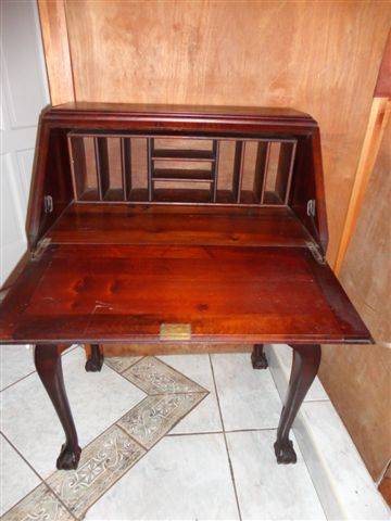 Imbuia desk with single drawer. Top opens up to reveal compartments.