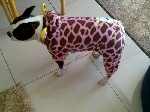 THIS IS MY BOSTON TERRIER WEARING AN XXL OUTFIT!