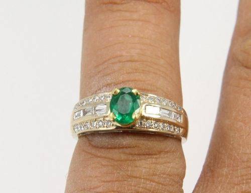 NEW 18KT YELLOW GOLD DIAMOND AND COLUMBIAN EMERALD BAND RING. THIS RING FEATURES A NICE OVAL CUT COLUMBIAN EMERALD GEMSTONE IN THE CENTER OF THE RING THAT MEASURES 6MM BY 4.8MM IN SIZE. THIS EMERALD HAS A VIBRANT MEDIUM GREEN COLOR. THIS RING ALSO FEATURES 34 DIAMONDS(28 ROUNDS AND 4 BAGUETTES). THESE DIAMONDS ARE G-H IN COLOR WITH A CLARITY OF VS1-VS2. THE TOTAL WEIGHT OF THE DIAMONDS IS APPROX 1/2 CT. THIS RING HAS A NICE FILIGREE DESIGN AS SEEN IN THE PICTURES. THIS RING WEIGHS 4.7 GRAMS.