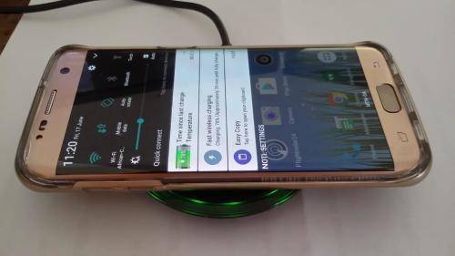 The ring around the charging pad turns green when you place a fast charging Qi-compatible device down (such as an S7, Note 5 or S6 Edge +), or blue for standard Qi-devices (S6 & S6 Edge). It will adjust brightness automatically depending on the lighting in your room.