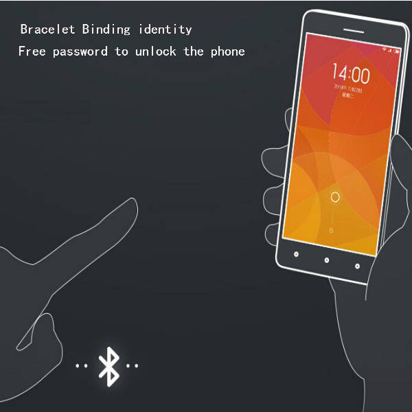 * Bracelet Binding identity, free password to unlock the phone: Forget about complicated unlock password, gestures, simply raised his hand to move to the next cell phone, "shua" is heard, immediately safe unlocked. Xiaomi account with your 1 on 1 binding, identify your identity, to better protect the safety of mobile phone information. Note: Equipment requirements: Xiaomi3/ Xiaomi4/ Xiaomi Redmi NOTE 4G with the system is Android4.4 and above MIUI or Android 5.0 above, and support for Bluetooth 4.0.