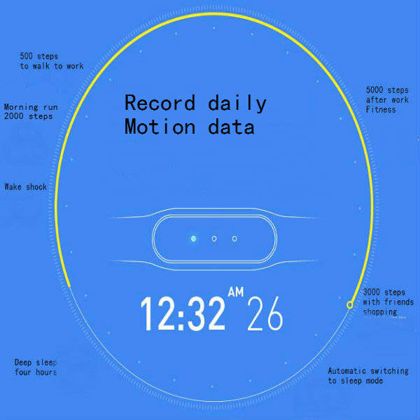 * Record daily motion data: Xiaomi bracelet to help you record all-day event, calculate walking distance, and calorie consumption.