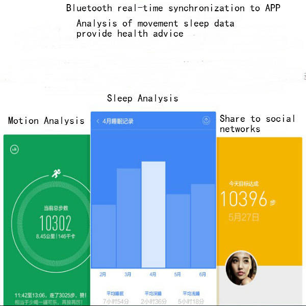 * Bluetooth real-time synchronization to APP: analysis of movement sleep data, providing health advice.