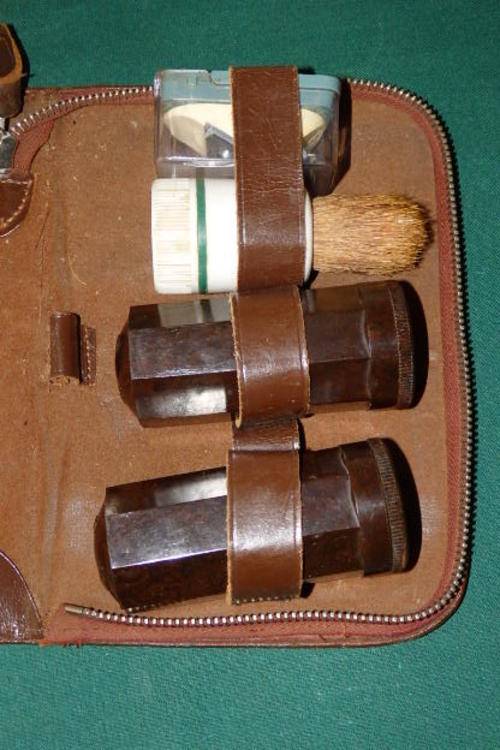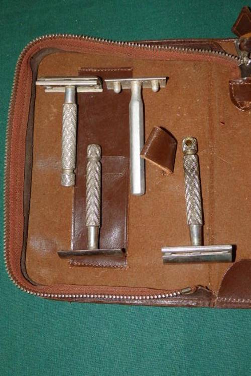 THIS COLLECTION OF GENTLEMAN'S VINTAGE SHAVING PARAPHERNALIA IN A BROWN ZIPPER CASE HAS A COUPLE OF SINGLE BLADE RAZORS/ SPARES, SHAVING ACCESSORY CANISTERS, A BRUSH, A RAZOR ATTACHMENT AND THE BROWN ZIPPER CASE. THE COLLECTION COULD ADD SOME PIECES TO YOUR COLLECTION. YOUR ONCE BID GETS ALL THESE PIECES.