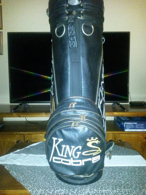 Up for auction is a vintage King Cobra Oversize 10" staff golf bag. The main color is black with white and gold lettering. It has 3 fur lined dividers. It has 6 zippers. 2 umbrella wells. 2 towel rings. Trunk handle. Padded carry strap ( not original) and a original rain cover. This bag is still is in a really good usable or collectible condition. All the zippers work, no holes, rips or tears. It weighs approx 5 - 6kgs. Please see attached pics of the actual bag on auction and the condition of the bag. Postage will be option 3 via the post office counter to counter. Unfortunately due the size of the item the postage is high. Your also able to arrange for your own transport for this bag.