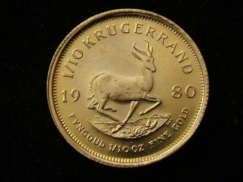 You are bidding on a 1/10th of an oz Fine Gold Kruger Rand dated 1980