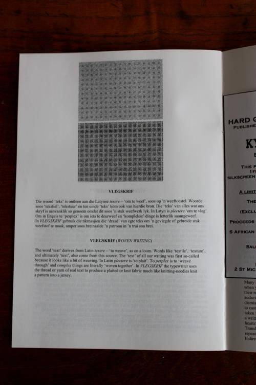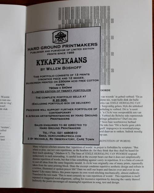 In 1980 six poems were selected from KykAfrikaans, enlarged and silk-screened in a limited edition. This new edition, printed in 2003 contains twelve poems, different from the six previously published.