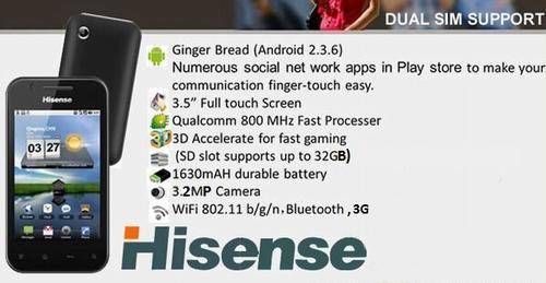 If you are looking for an Android powered standard mobile phone having all those useful features needed for personal entertainment and as well as suitable for business, HiSense has launched the HiSense U1 Android Smart mobile phone that is designed for you. It has 3.5 inch capacitive touch screen display and runs on Android 2.3 (Gingerbread), It is powered by a Qualcomm MSM7225A, 800MHz Processor and comes with Dual SIM (GSM,HSDPA + GSM) support The phone is capable of running two SIM cards that great for keeping ones personal and business life separate by switching two numbers in a single mobile phone. It has a 3.2 Megapixel fixed focus camera to take pictures/videos,  Other features include, 512MB internal memory and 4GB of internal storage where the user can store the images, videos, mp3 in the phone's memory which could also expanded up to 32GB with MicroSD slot, The connectivity features include, GPRS/EDGE/HSPA, Bluetooth 2.1 , Wi-Fi and Built-in GPS (GPS+AGPS) all in a stylish design.