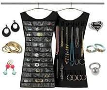 36 clear pockets on one side hold earrings, rings, watches, pins, make-up and other small items. On the reverse, 18 tabs with hook-and-loop closures accommodate long necklaces, chunky bracelets, and other bulky items like headbands, belts, and scarves that most pocket organizers don't fit. The metal hanger can hang on a closet pole, wall or back of a door and the swiveling head provides easy access to both sides. With a simple flip, contents are visible at a glance. This is one LBD that always fits and never goes out of style!