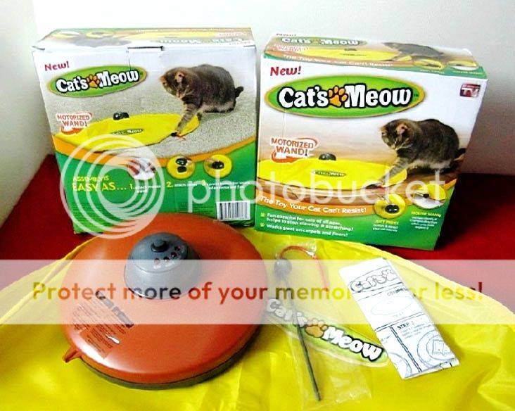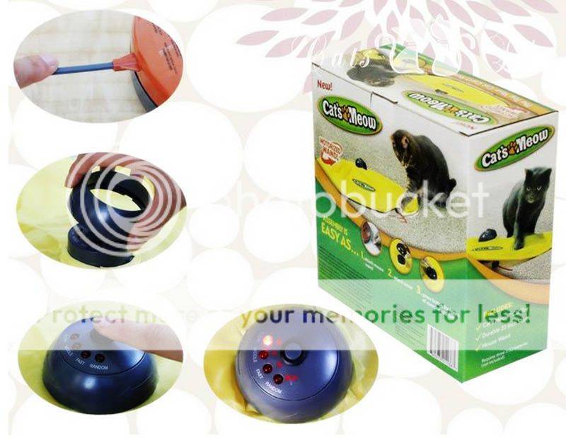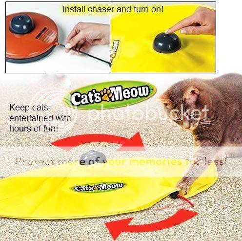 Peek-a-boo wand mimics a scurrying mouse Randomly changes speeds and directions to keep cats entertained Never-quit motor just keeps on running even when your cat pounces Made of durable rip stop nylon Cat's Meow is the perfect gift for every cat lover Battery operated Cats of all ages love Cat's Meow Cat’s Meow Yellow Undercover Fabric Moving Mouse Cat Play Cat's Toy As Seen on Tv Just place on floor, press button and watch your cat try to keep up with the moving wand. It darts and scurries like a real mouse, randomly changing speeds and directions. Keeps cat occupied so he or she doesn’t scratch and destroy furniture, carpets or curtains. Durable mat (23" diam.) uses 3 “C” batteries (not incl.). sold brand new