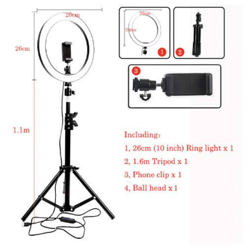 Dimmable 10 inch 26cm selfie ring light black with 1.6m tripod stand