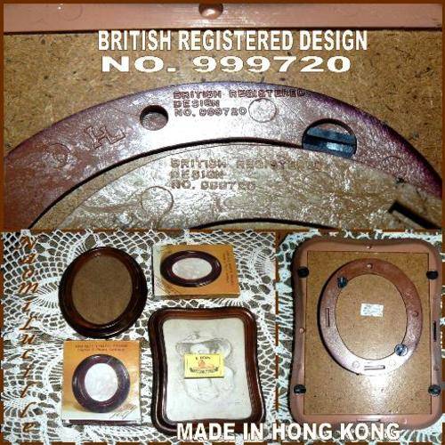 *****LOVELY SET OF FOUR YESTERYEAR'S "ANTIQUE" BAKELITE PHOTO FRAMES - WALL HANGING. MADE IN HONG KONG - BRITISH REGISTERED DESIGN NO: 999720 ON TWO OF THEM. STILL IN VERY GOOD CONDITION FOR THEIR AGE. NO DAMAGE TO GLASS IN ANY OF THE FOUR FRAMES. ALL FOUR OF THE FRAMES CAN BE HUNG EITHER HORIZONTALLY OR VERTICALLY. I AM NOT SURE WHAT MEDIUM THEY ARE MADE OF?? BAKELITE??? PLEASE REFER TO IMAGES/PHOTOGRAPHS*****