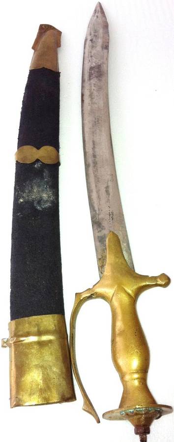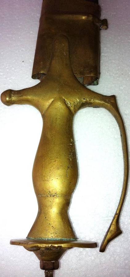 Sikh Kirpan with heavy Brass Hilt. Good kirpan untouched as found condition.The blade has seen some action with some nicks to the cutting edge which can be ground out. There is some kind of swirl pattern on the blade. Some oxidation due to age. The Hilt is well constructed and of typical Tulwar form. Comes with the original scabbard.