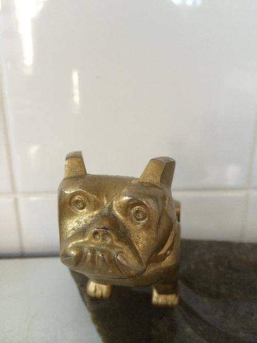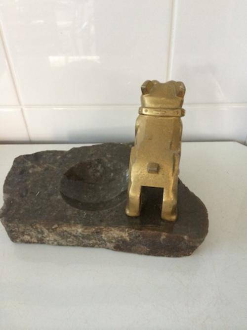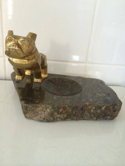 "Mack" Truck Cubist Bulldog STAMPED MACK DESIGN PATENT 87931 mounted on stone? Ashtray, Chrome with Gold Tone, Measuring 14cm Length (Bulldog) x 20cm Length of Ashtray x 12.5cm Height from base to Top of Head. A Real Advertising Gem for the Serious Collector!!! RARE TO FIND!!!