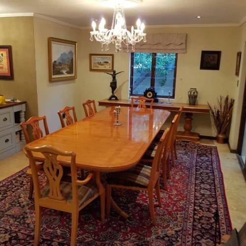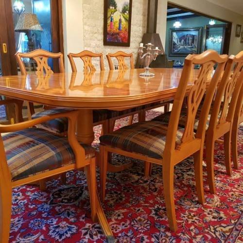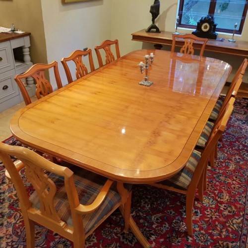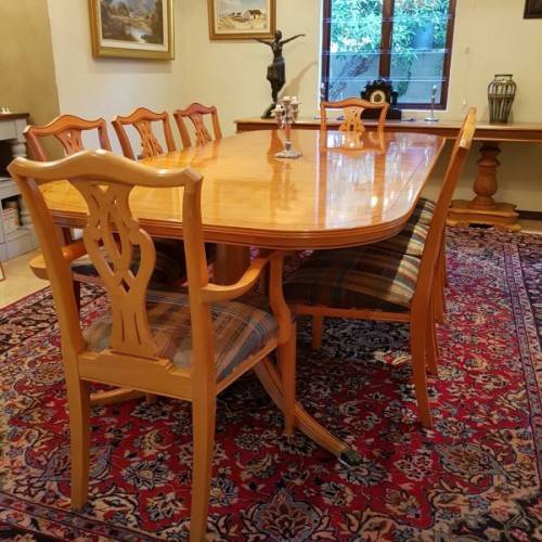 THIS SPECTACULAR ORIGINAL "GORDON FRASER" YEW WOOD CHIPPENDALE 8 TO 10 SEATER DINING ROOM SUITE IS IN STUNNING CONDITION AND MEASURES AS FOLLOWS: THE EXTENDABLE DINING ROOM TABLE MEASURES A VERY DECENT 241cm LONG X 121cm WIDE x 78cm HIGH (WHEN CLOSED) AND 294cm LONG x 121cm WIDE x 78cm HIGH (WHEN OPEN), THE TWO CHIPPENDALE CARVER/ ARM CHAIRS ARE 59cm LONG x 50cm WIDE x 97cm HIGH AND THE SIX DINING CHAIRS ARE 53cm LONG x 48cm WIDE x 97cm HIGH. THIS IS A TOP QUALITY EXPENSIVE DINING ROOM SUITE WHICH HAS A REPLACEMENT VALUE OF R 125 355.00. PLEASE VIEW THE PICS CAREFULLY TO FULLY APPRECIATE THIS INCREDIBLE GORDON FRASER CHIPPENDALE DINING ROOM SUITE AND TO CONFIRM THE CONDITION.