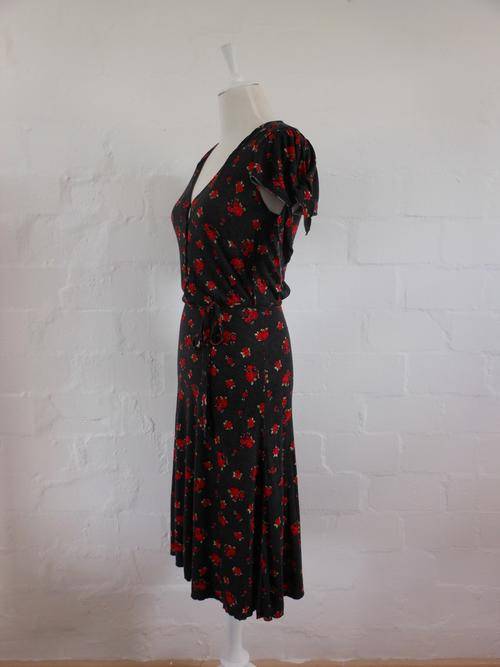 *MARION & LINDIE CLASSIC* DESIGNER FLORAL PRINT BLACK RED TIE WAIST DRESS - SIZE 8
