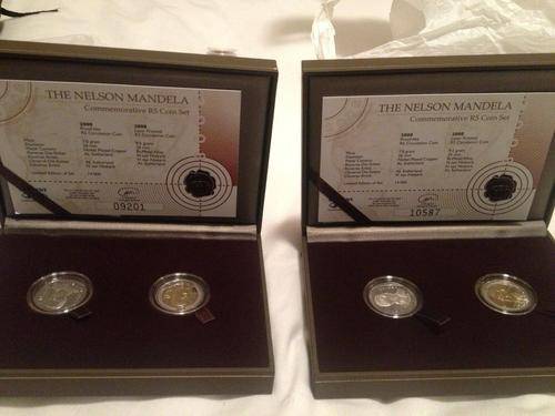 2 x Nelson Mandela R5 Commemorative set, proof like + laser frosted (Un-tampered) in SA Mint packaging