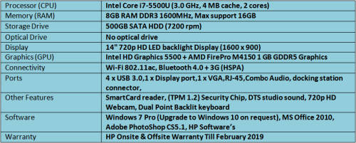 8GB RAM(1600 MHz),500GB HHD,14" 720p HD Anti-Glare Display(1600X900),AMD FirePro M4150 1GB DDR5 Graphics,3G