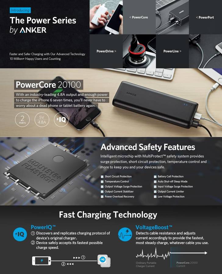 Exclusive to Anker, PowerIQ and VoltageBoost combine to ensure your devices charge at their their fastest possible charge speed.