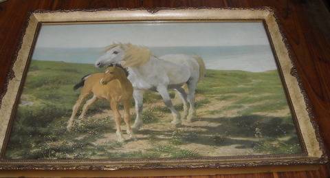 This is a lovely print of Mother and Son horses in the field close to the sea. Originally painted by H.W.R. Davis R.A. (1833-1914). Beautifully painted and the print looks like the "real thing"!! A stunning ornate frame in wonderful condition - this print and frame have been very well looked after. One or two slight light foxing across the sea however you only see it if you look for it. Picture in frame measures 45cm x 50cm. Glass in excellent condition. Postage R100