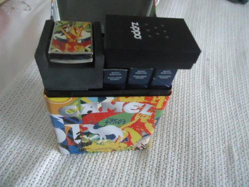 THIS CAMELTIN IS LINED WITH RUBBERIZED FOAM WITH A SPECIALLY CUT PLACE FOR THE CAMEL ZIPPO LIGHTER, AND THE 3 PACKS OF CIGARRETES WITH THE ZIPPO BOX USUALLY LYING UNDERNEATH THE 3 PACKS OF CIGARRETTES, (FOR PHOTOGRAPHIC PURPOSES THE ZIPPO BOX IS SEEN ABOVE THE CIGARETTE BOXES).