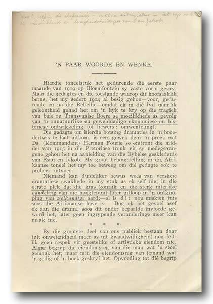 'n Esau, Bosveld-drama in vier tonele deur JFW Grosskopf, Pierneef, E. Mayer (3e Druk 1923). A5, sagteband, 81 bls. Buiteblad redelik verweer. Boek binne in leesbare toestand. Sommige bladsye het potlood-onderstreep en aantekeninge op.
