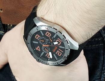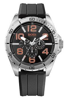 Classic styling and a full range of features make this Hugo Boss watch, the perfect watch for any ensemble, day or night. With its stylish black silicone band and chic black dial with silver and orange accents, this watch easily compliments a business suit then transitions as the perfect accessory for a night out on the town. This timepiece offers reliable analog-quartz movement and is protected by a durable mineral crystal. Additional features include water resistant up to 30 meters and measures seconds.