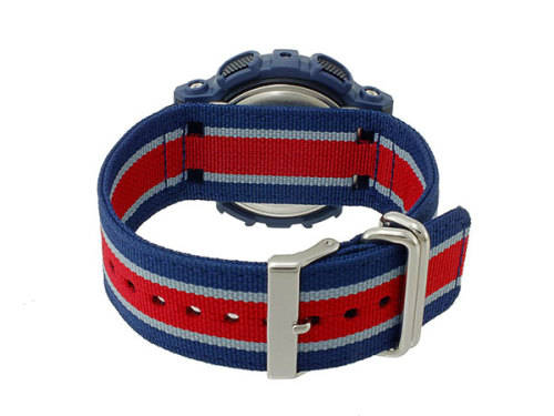 G-SHOCK has again combined rugged functionality and tough style with the latest addition to its ever-expanding range of technically fashionable timepieces: the GA100MC Military Cloth. By incorporating the raw durability of military stripped nylon webbing, an additional suggestion of adventure has been added to the iconic GA100 series. All models are magnetic resistant, 200M water resistant, shock resistant, employ a reverse LCD display, and feature , 48-city World Time, 1/1000th Sec. Stopwatch, Countdown timer , Auto LED light and of course, 12/24 hour formats for true military timekeeping. Red analog and digital watch with a blue face.