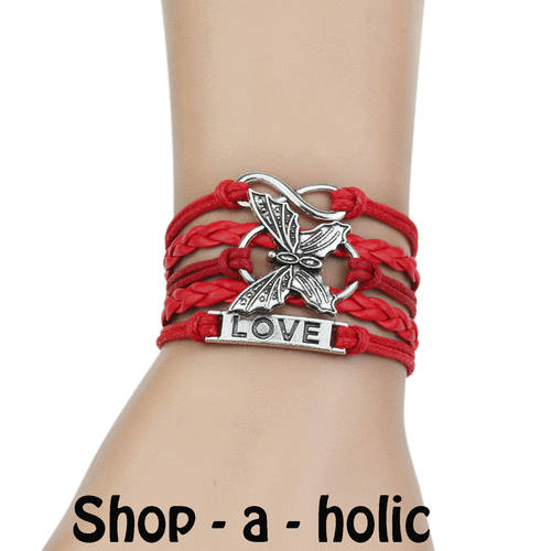 ***NEW - GENUINE LEATHER BRAIDED CHARM BRACELET - LOVE BUTTERFLY RED***