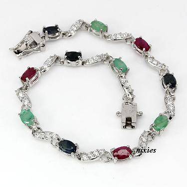 **NEW** LOVELY GENUINE EMERALD, RUBY & SAPPHIRE 925 STERLING SILVER BRACELET