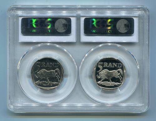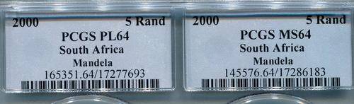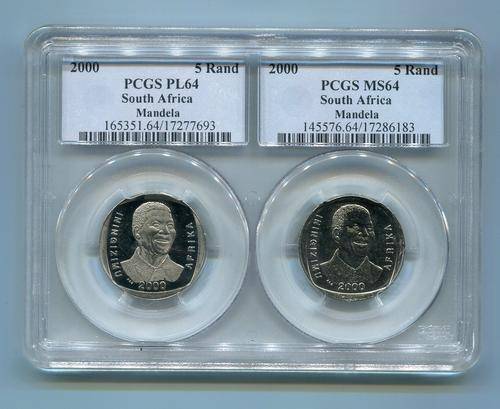 SLABBED GRADED PCGS PL 64 Nelson Mandela PROOF LIKE 2000 R5 coin + MS 64 UNCIRCULATED R5 COIN in JOINT COMBINATION SLAB !