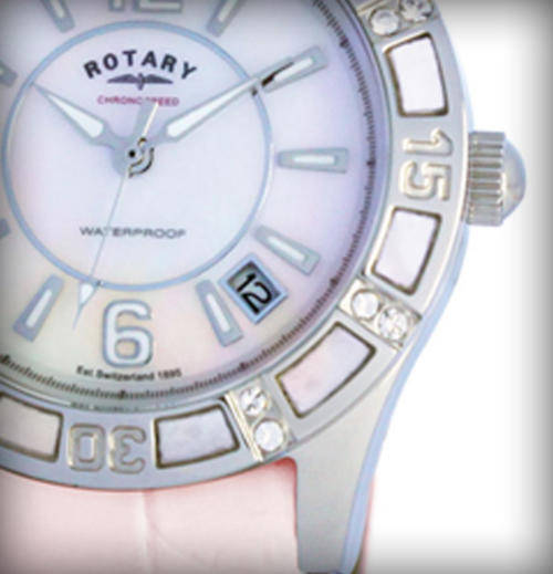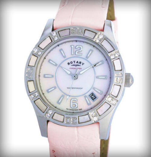The Rotary LS03444/41 Ladies Mother of Pearl Pink Watch comes with a stone set silver-coloured round case .