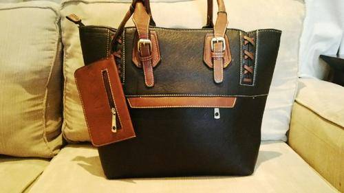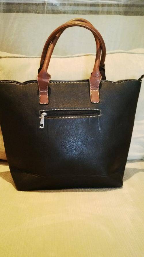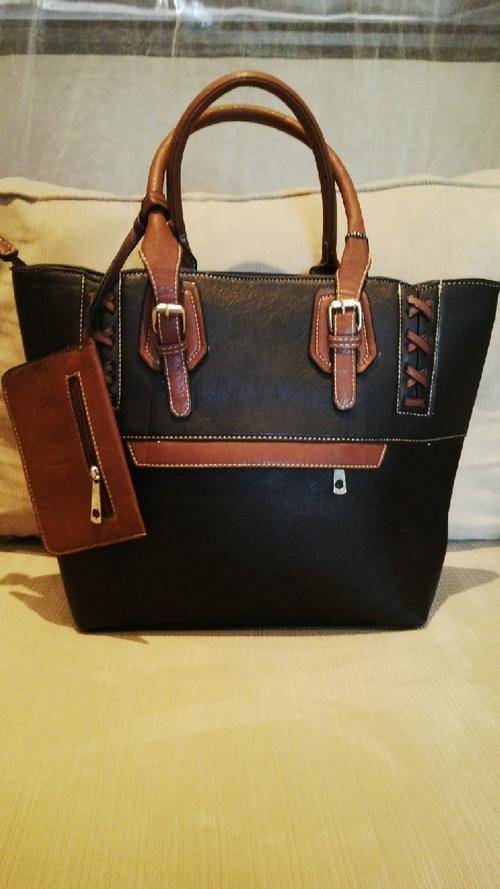 Stunning Ladies 2pc BLACK/TAN PU Leather Handbag, has great detail and design on the front and a compartment, comes with a coin wallet or this can be used for anything you like, HUGE!! Beautiful Piece!!!