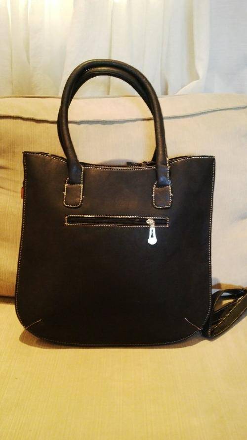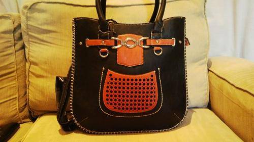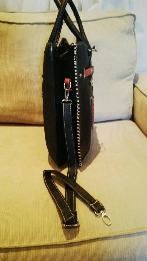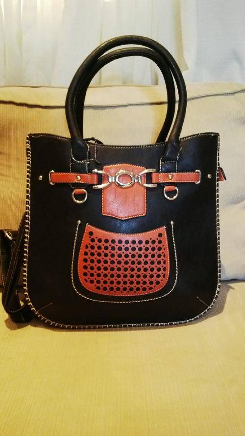 Stunning Ladies BLACK/TAN PU Leather Handbag or Shoulder Bag With Beautiful Detail & Design, can be worn on your hand or carried Sling style, 3 divided sections on the inside, great space for just about anything and everything, BEAUTIFUL PIECE...